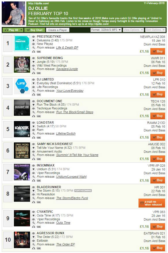 Here’s my first chart of 2016 featuring tracks from the full range of drum & bass styles. As always, if you like any of these tunes please support the artists & labels by buying the tunes and recommending them to your friends. Check out the full chart on the JunoDownload site http://www.junodownload.com/charts/dj/525928-DJ_Ollie/1779334-Chart/
